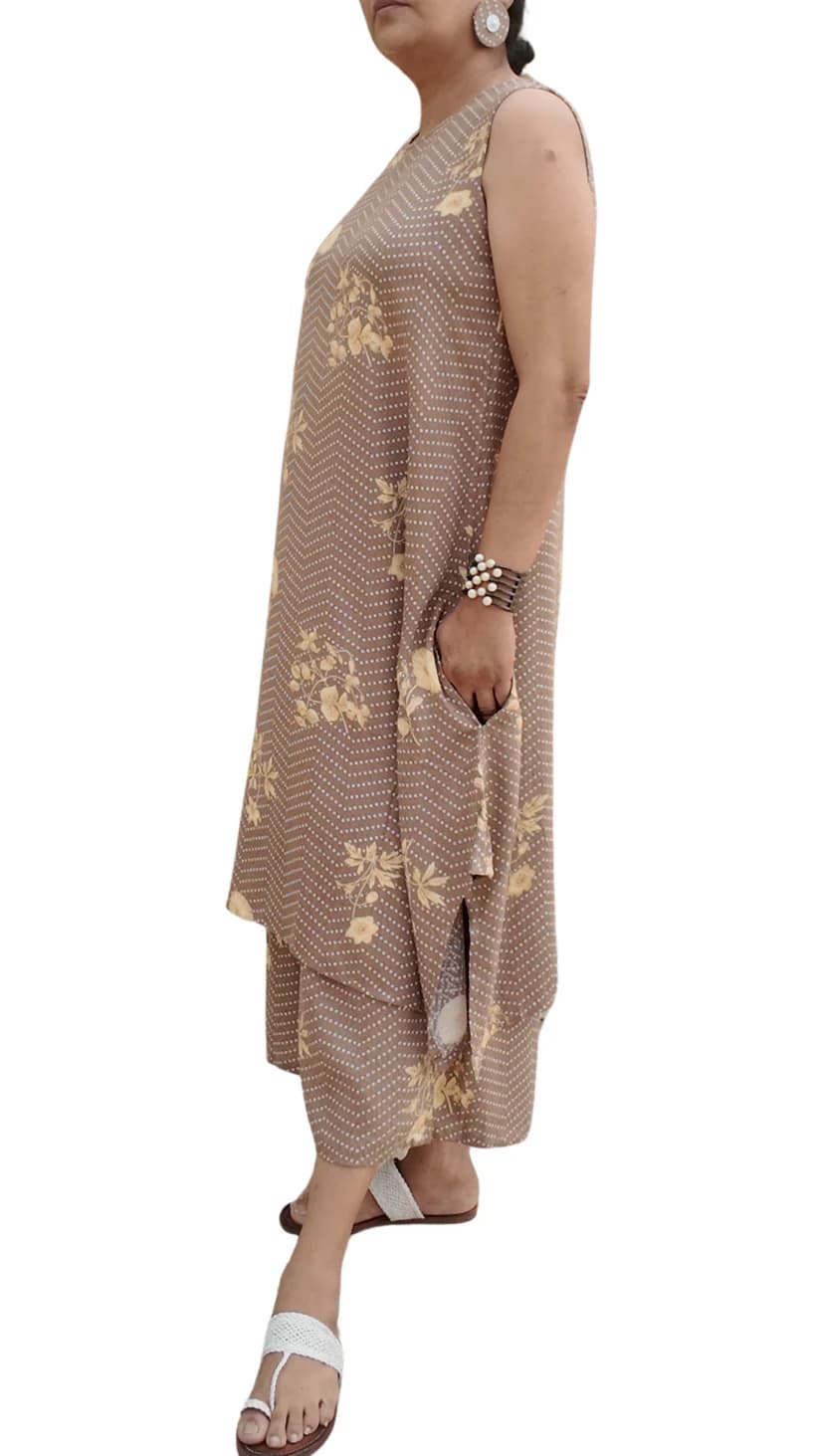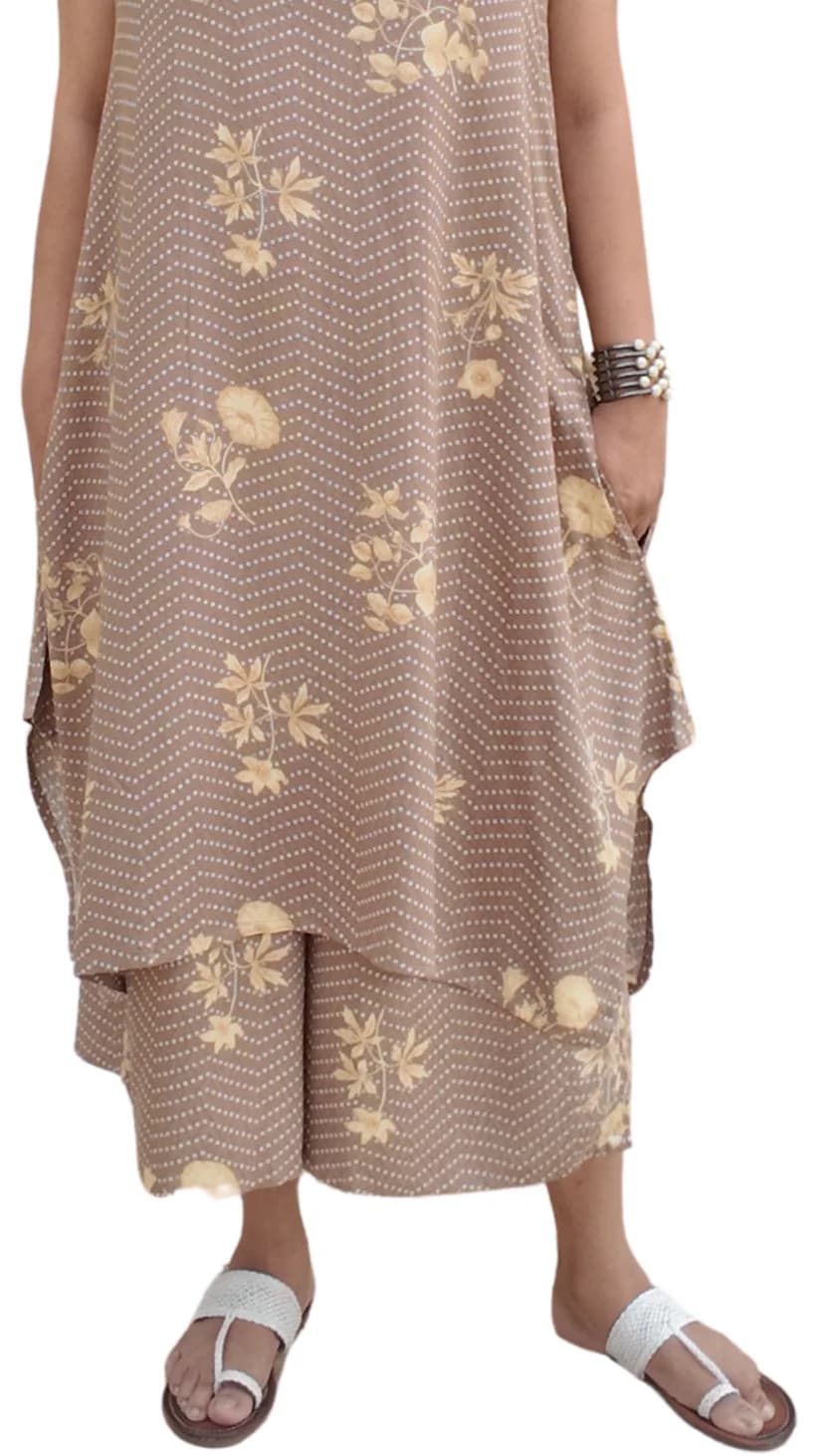 Discover the beauty of simplicity with NARMADAA, our sleeveless kurti paired with comfortable palazzo pants. Designed for the woman who values comfort without compromising on style, this set is airy, elegant, and perfect for everyday wear. Lightweight and versatile, NARMADAA transitions seamlessly from casual outings to relaxed evenings. To complete the look, it comes with our statement matching fabric earrings, giving you a coordinated and chic appearance with ease. An everyday essential that feels as good as it looks—NARMADAA is comfort, styled beautifully.